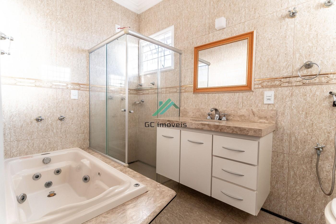 Com 4 suítes, sendo 3 no piso superioros e uma delas com banheira de hidromassagem. Ainda no andar superior, há uma cozinha de apoio