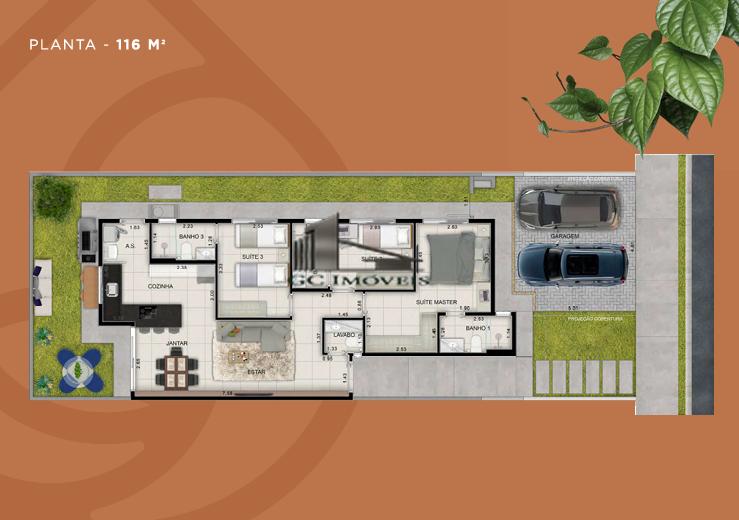 Com 3 dormitórios, sendo 3 suítes, 1 banheiro social, sala, cozinha, lavanderia, quintal e garagem com capacidade para 2 veículos