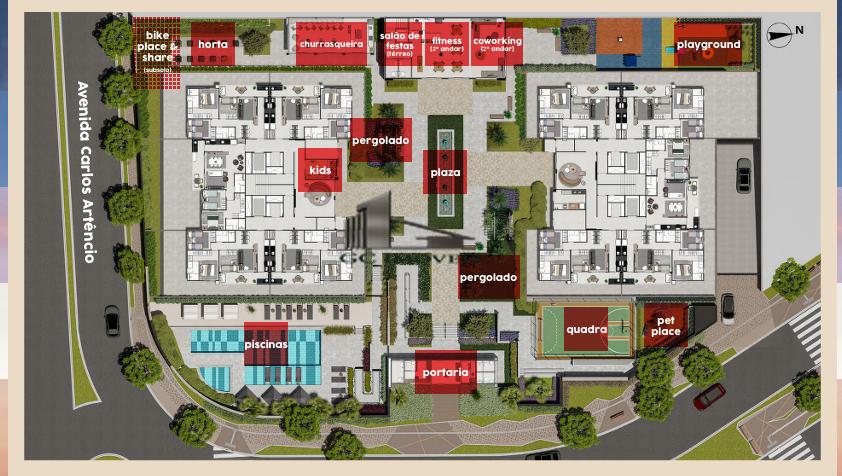 O condomínio conta com uma ampla estrutura de lazer e conveniência, incluindo rooftop, salão de festas, espaço fitness, coworking, piscinas adulto e infantil, playground, pet place e áreas comuns decoradas.