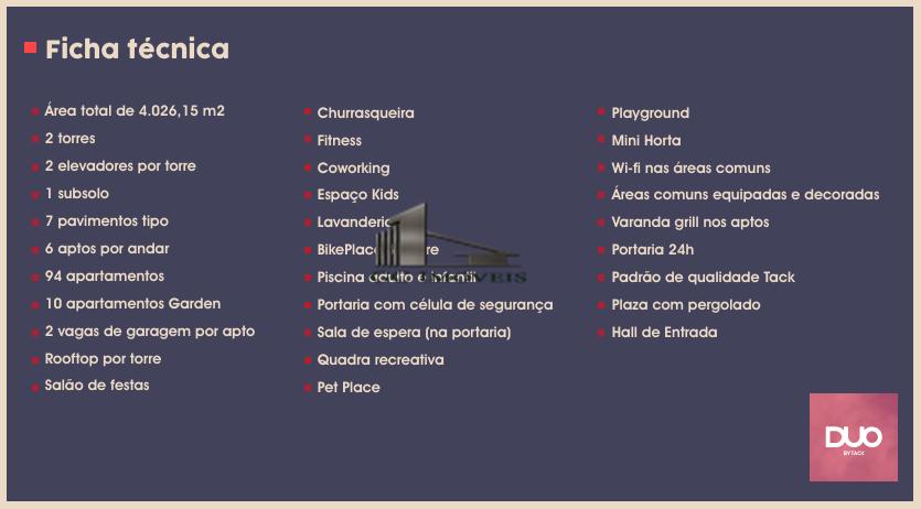 Infraestrutura do Condomínio: Elevador, Fitness e Crossfit, Jardim, Lounge de Festas, Bicicletário, Campo de Futebol, Circuito da câmeras, Piscina, Playground, Portaria 24hrs, Praças, Quadra Poliesportiva, Monitoramento 24hrs, Salão de Festas.