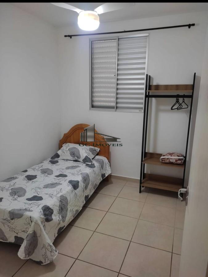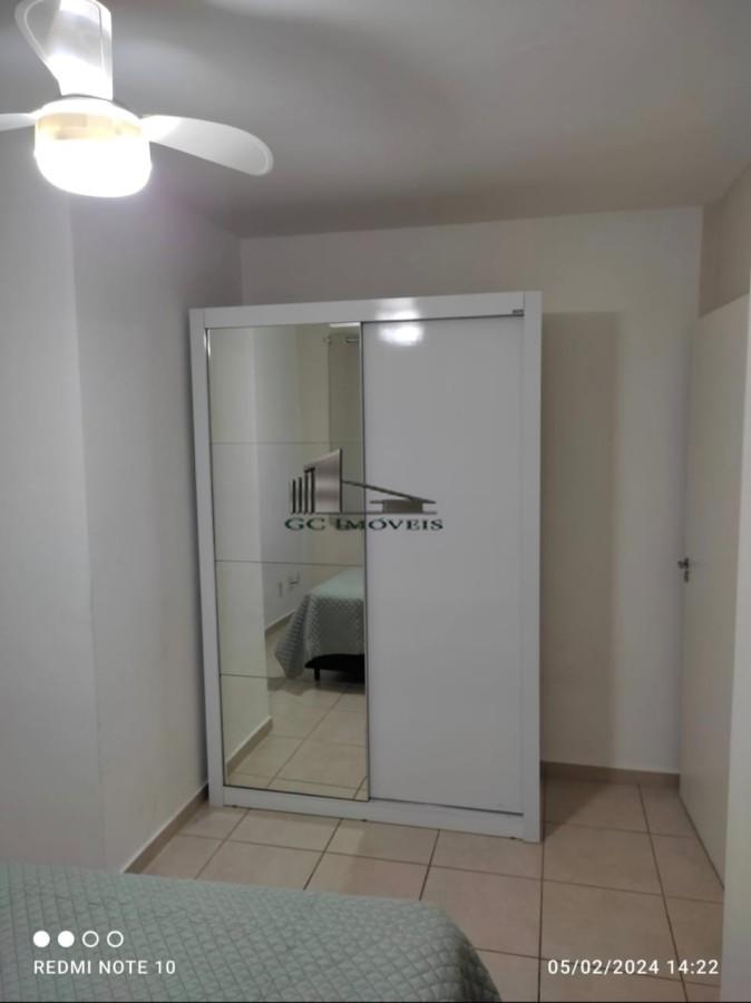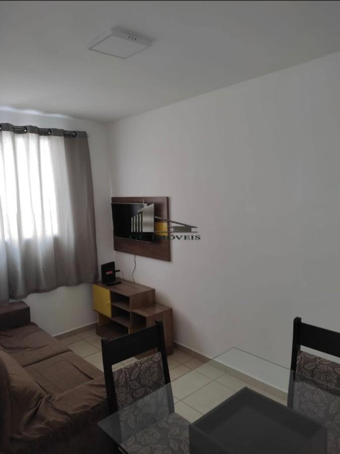Apartamento totalmente mobiliado, incluindo sofá, painel, TV, mesa com 4 cadeiras, armários na cozinha, micro-ondas, geladeira, fogão, máquina de lavar, cortinas na sala e no quarto principal, cama de casal, cama de solteiro e arara organizadora.