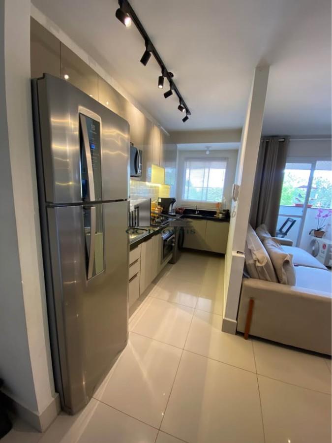 Com 2 dormitórios, possui 1 banheiro com box blindex, cozinha repleta de armários planejados, com fogão cooktop e forno elétrico, área de serviço, sala de TV integrada com a sala de jantar com sacada, ar condicionado e espelho planejado, garagem coberta para 1 veículo.