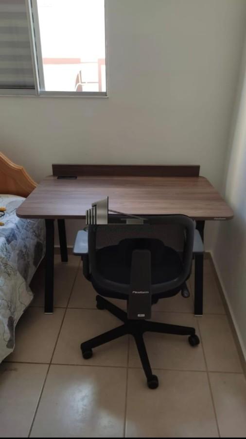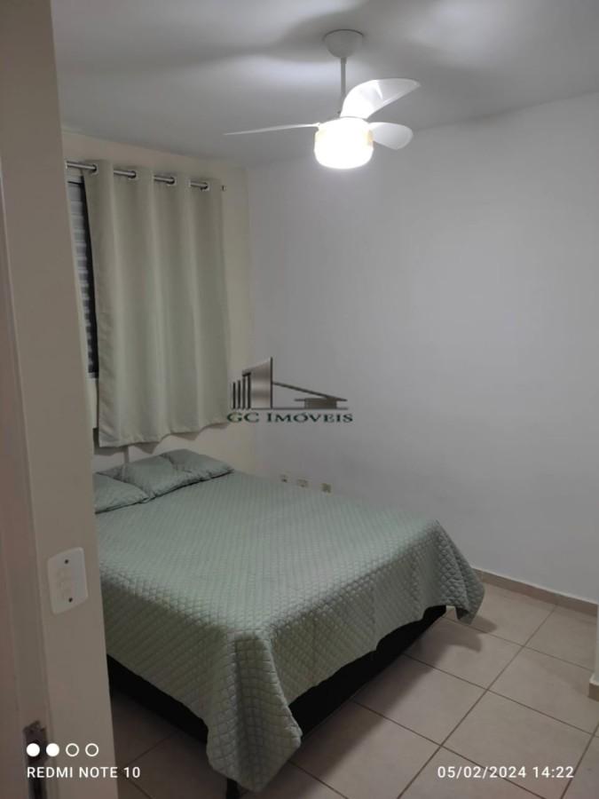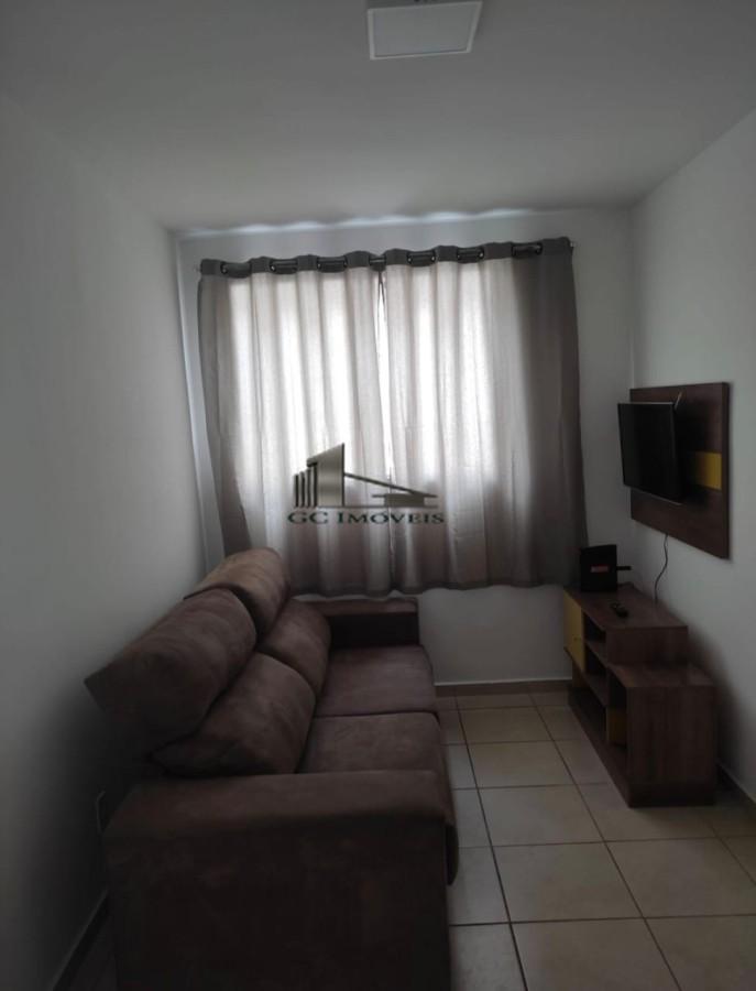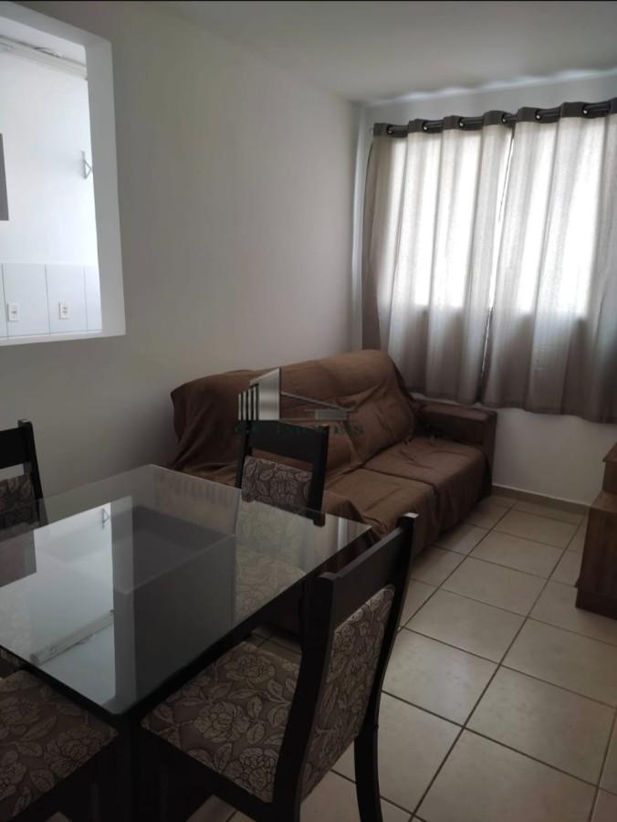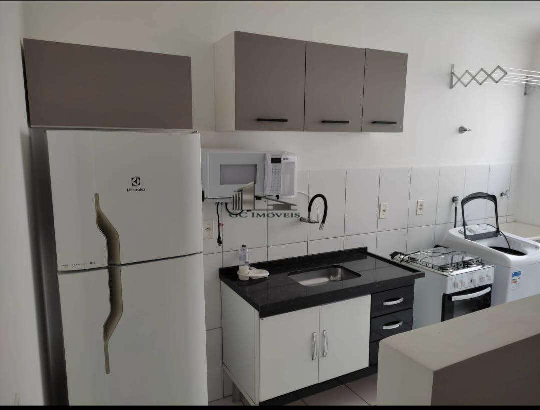 Apartamento totalmente mobiliado, incluindo sofá, painel, TV, mesa com 4 cadeiras, armários na cozinha, micro-ondas, geladeira, fogão, máquina de lavar, cortinas na sala e no quarto principal, cama de casal, cama de solteiro e arara organizadora.
