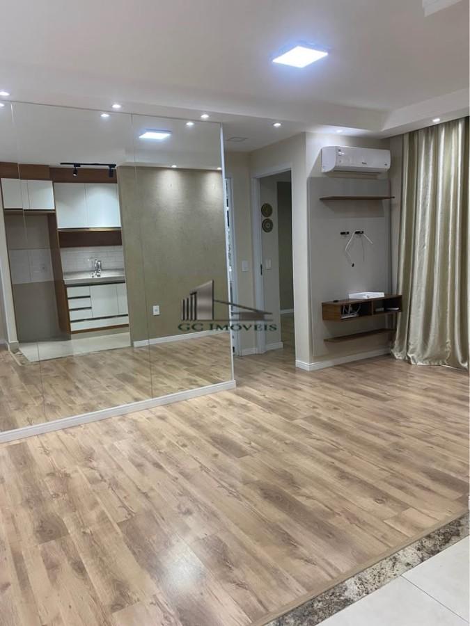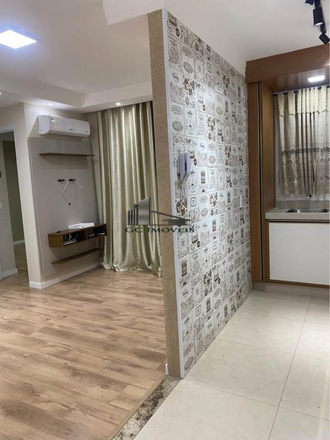Com 2 dormitórios, ambos com ventilador de teto, possui 1 banheiro com box blindex e armários planejados. Sala com painel de TV, ar condicionado, sanca de gesso, iluminação em LED e espelho, sacada, área de serviço, cozinha repleta de armários planejados e coifa, garagem para 1 veículo.