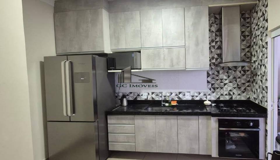 Com 3 dormitórios, sendo 1 suíte, banheiro social, sala com pé direito alto e ar condicionado, cozinha com armários planejados, coifa, fogão cooktop 4 bocas e forno elétrico, jardim de inverno entre 2 dormitórios, churrasqueira e garagem coberta para 2 veículos.