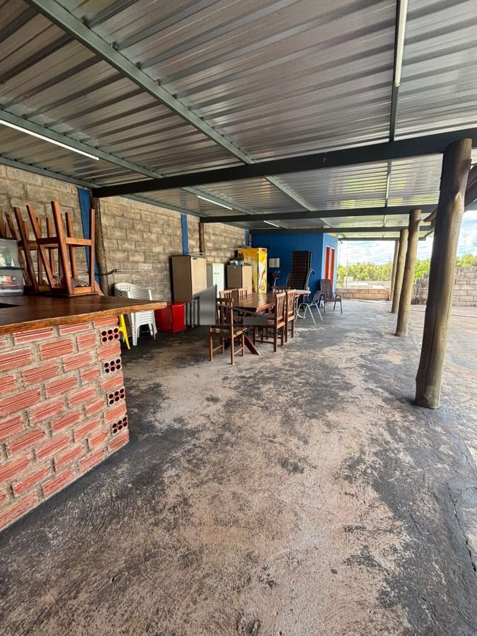 A parte externa conta com churrasqueira, balcão, pia, gabinete, chuveirão, 2 banheiros (sendo 1 finalizado e outro para finalização - atualmente usado para guardar equipamentos) piscina de 4x8 conta com hidromassagem e cascata